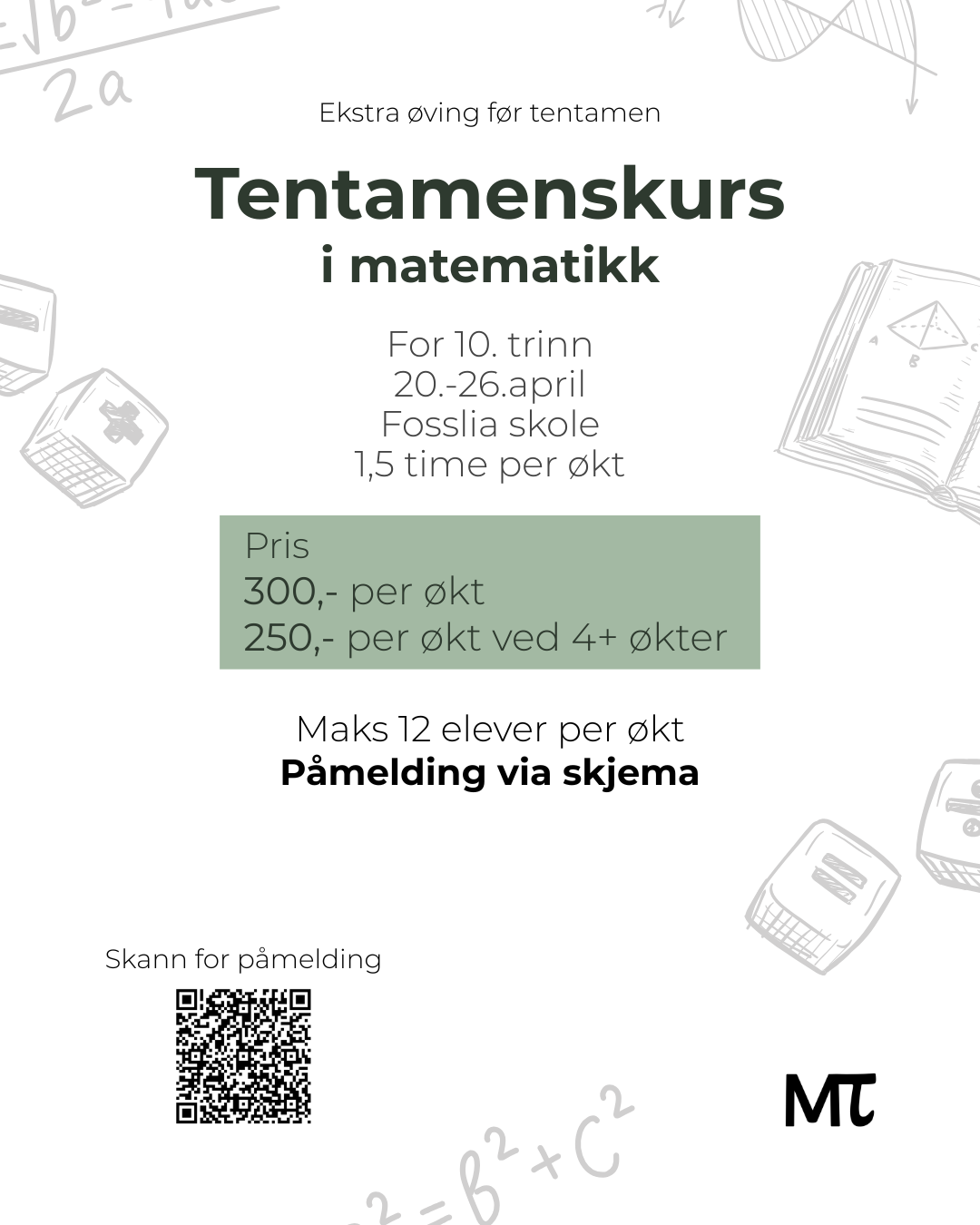Fra 20.-26. april arrangeres tentamenskurs i matematikk for 10. trinn. Her får elevene mulighet til å arbeide med tentamens- og eksamensrettede oppgaver med veiledning underveis. På denne måten blir de bedre kjent med oppgavetypene, og litt ekstra øving i forkant kan gjøre mye for tryggheten før tentamen.